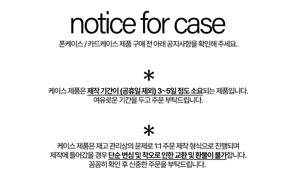 - 주문 제작 상품의 경우, 개봉 및 사용 흔적이 없더라도 교환/환불이 불가능합니다.